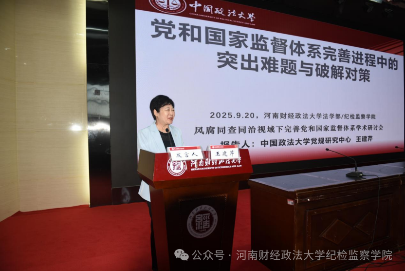 中国政法大学党内法规研究中心副主任王建芹教授作题为《党和国家监督体系完善进程中的突出难题与破解对策》的主旨演讲。王建芹教授聚焦监督体系完善进程中的难题与对策,深入剖析了当前监督工作存在的协同性不足、基层监督效能薄弱等突出问题,并提出应精准把握监督体系构建的时代背景,加强党规之治,推动依法治国与依规治党有机统一。