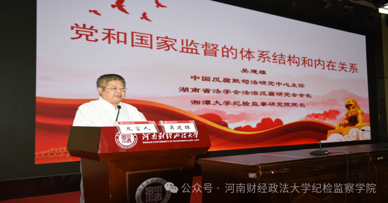 中国反腐败司法研究中心主任、湖南省法学会法治反腐研究会会长、湘潭大学纪检监察研究院名誉院长吴建雄教授作题为《党和国家监督的体系结构和内在关系》的主旨演讲。吴建雄教授在系统阐述党和国家监督体系的构建历程与内在逻辑后指出,党和国家监督体系是党的自我革命思想与人民监督思想的有机结合,应以党内监督为主导,通过一系列机制实现各类监督的贯通协调,为反腐败斗争筑牢制度根基。